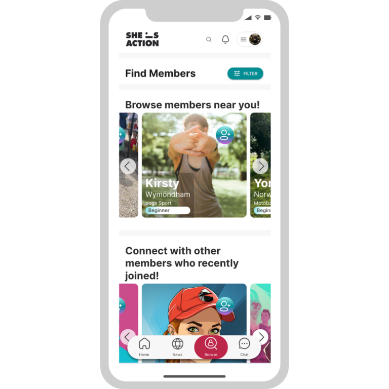 Use our “Tinder” style system to find new likeminded friends by location, sporting interest, experience and even age